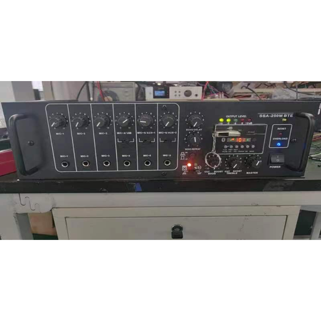 DC24V/AC220V Impedance: 4-8Ω 70V,100V Respons: 100HZ-1KHZ,power: 250w RMS/300W MAX 6-MIC,2-AUX Input,With USB/SD/MMC/BT WITH echo DELAY,ECHO REPEAT